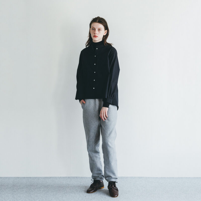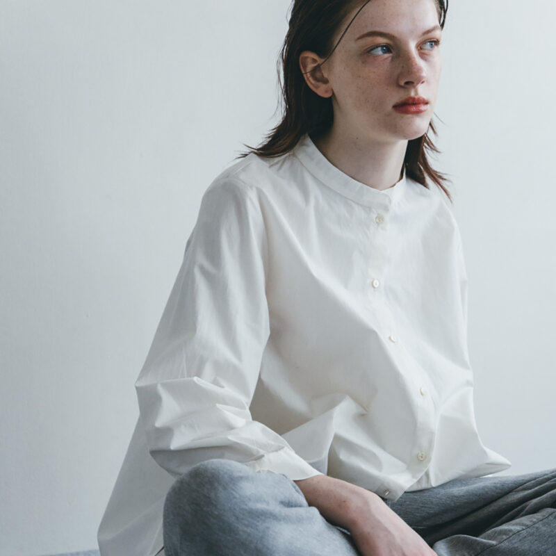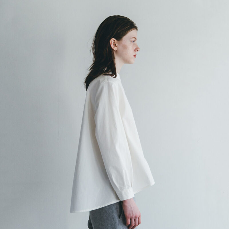 ベーシックな前開きタイプ、襟元はバンドカラーですっきりと。