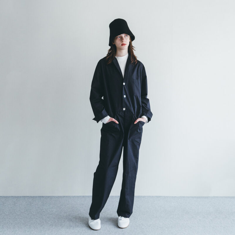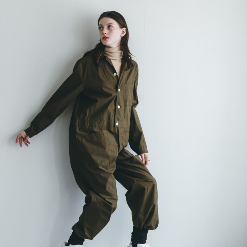 ハリのあるコットン素材は、ワークウェアのムード漂うジャンプスーツと相性ピッタリです。