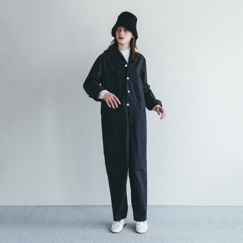 オールインワンならではのラフなゆとりは残しつつ、肩周りや裾幅、着丈はスッキリまとめた絶妙なバランスに仕上げています。