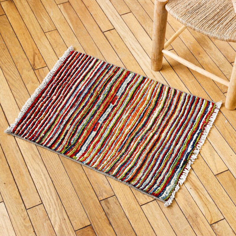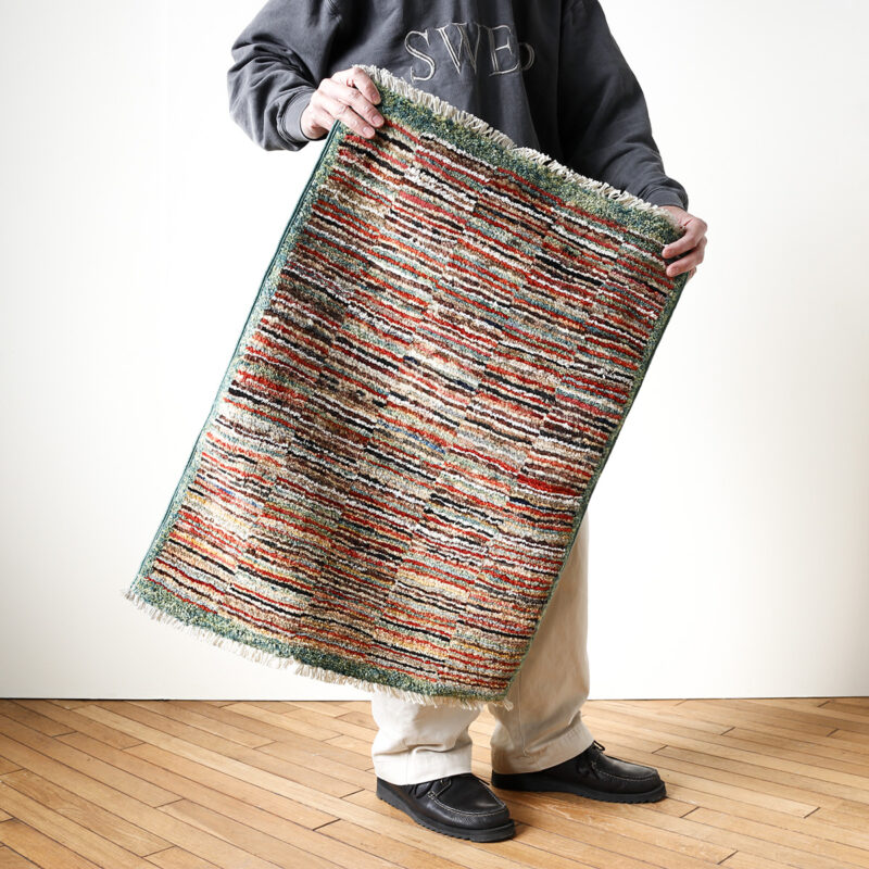 その中でもこちらの “Border Chobi” は、大判サイズのラグを織る際に出る「残糸」を利用して仕立てたもの。